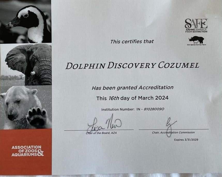 Cancún, Quintana Roo, 20 de marzo de 2024.- Dolphin Discovery, marca de hábitats para la interacción con mamíferos marinos de la familia The Dolphin Company, operador de parques de presencia mundial, anunció que sus parques de Isla Mujeres y Cozumel fueron reacreditados por la Asociación de Zoológicos y Acuarios (AZA, por sus siglas en inglés) por cumplir con los más altos estándares de cuidado animal.