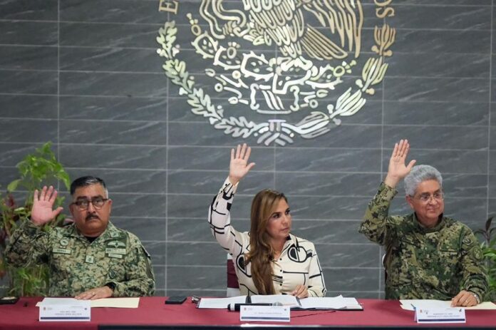 Isla Mujeres, Quintana Roo, 6 de marzo de 2024.- Autoridades de los tres niveles de gobierno, participaron en la primera sesión del Consejo Estatal de Seguridad Ciudadana, en la que aprobaron diversos acuerdos para continuar en las acciones de la estrategia de construcción de la paz y el nuevo modelo de seguridad.