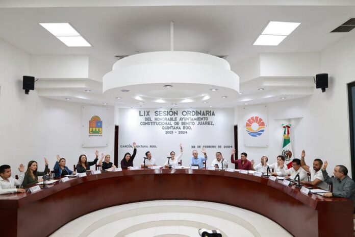 Cancún, Quintana Roo, 22 de febrero de 2024.- Al realizarse la Quincuagésima Novena Sesión Ordinaria, los integrantes del Ayuntamiento de Benito Juárez aceptaron por unanimidad de votos la Estrategia Anticorrupción Municipal, como parte de la alineación con las estrategias estatales en la misma materia.