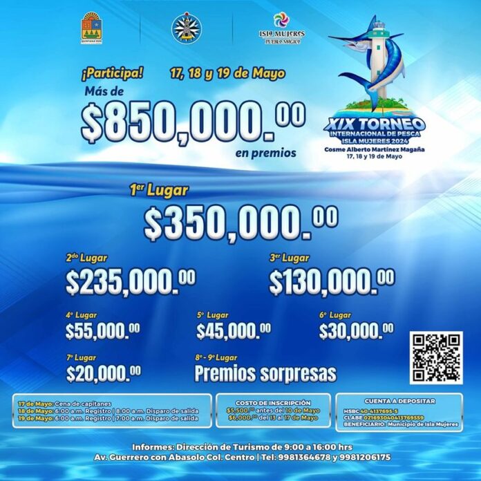 Isla Mujeres, Quintana Roo, 1 de abril de 2024.- Con una bolsa total de más de 850 mil pesos en premios en juego, el Gobierno Municipal de Isla Mujeres mantiene abierta las inscripciones para participar en el XIX Torneo Internacional de Pesca «Cosme Alberto Martínez Magaña», que se llevará a cabo del 17 al 19 de mayo en Isla Mujeres.