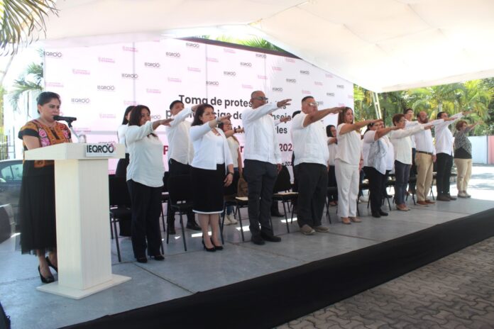 La Consejera Presidenta Rubí Pacheco Pérez, acompañada de las consejeras y consejeros, así como de integrantes de la Junta General, de representantes de partidos políticos y funcionariado del Instituto, en un acto protocolario en los patios del IEQROO, se otorgaron los nombramientos de las mujeres y hombres de los Consejos distritales y municipales, así como, la toma de protesta que estuvo a cargo de la Presidenta.